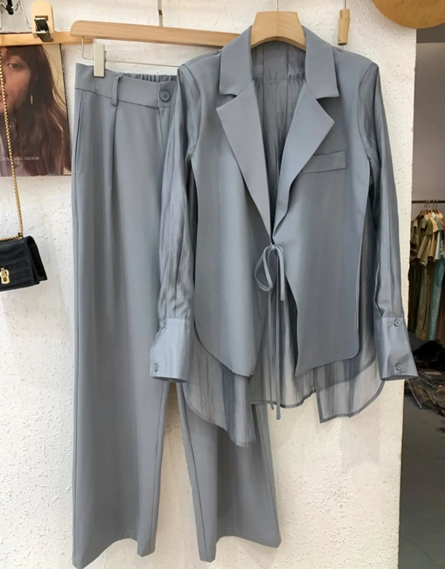 Tie up shirt top+straight suit wide leg pants two-piece set for women's long sleeves 2023 summer new style temperament set